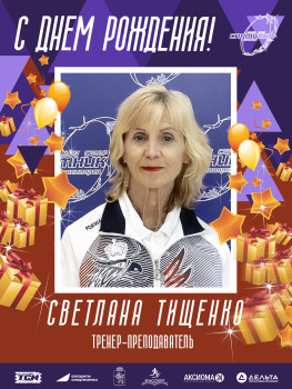 Поздравляем с днем рождения тренера-преподавателя отделения спортивной акробатики СШОР "Спутник", тренера-преподавателя высшей квалификационной категории, отличника физической культуры и спорта РФ, спортивного судью Всероссийской категории, мастера спорта СССР по спортивной гимнастике Светлану Тищенко! Пусть ваш дом будет полон тепла, уюта и веселья. Желаем крепкого здоровья, счастья, удачи, успехов в поставленных задачах. Спасибо за ваш труд Светлана Александровна!